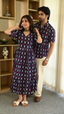 This Navy-Blue Printed couple matching outfit includes a women?s flowy cotton midi dress and a men?s short-sleeve printed shirt. Designed with cheerful floral prints, this set is perfect for summer outings, casual gatherings, or twinning on vacations.