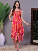 Level up your style with this trend-setting dress. Its vibrant abstract print and distinctive high-low handkerchief hemline create an eye-catching look. The tie-up shoulder straps ensure a comfortable and adjustable fit. Whether for daytime casual events or evening gatherings, this dress is the perfect choice for effortless flair.